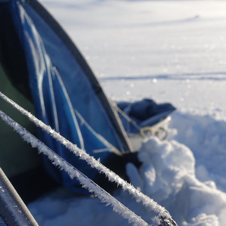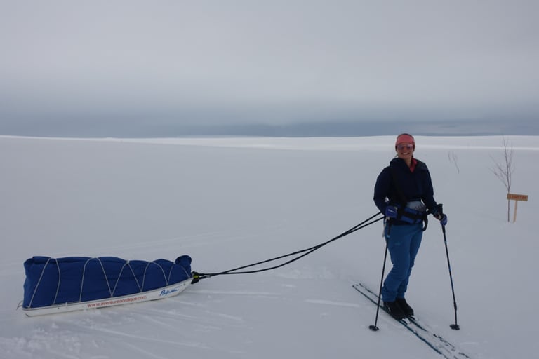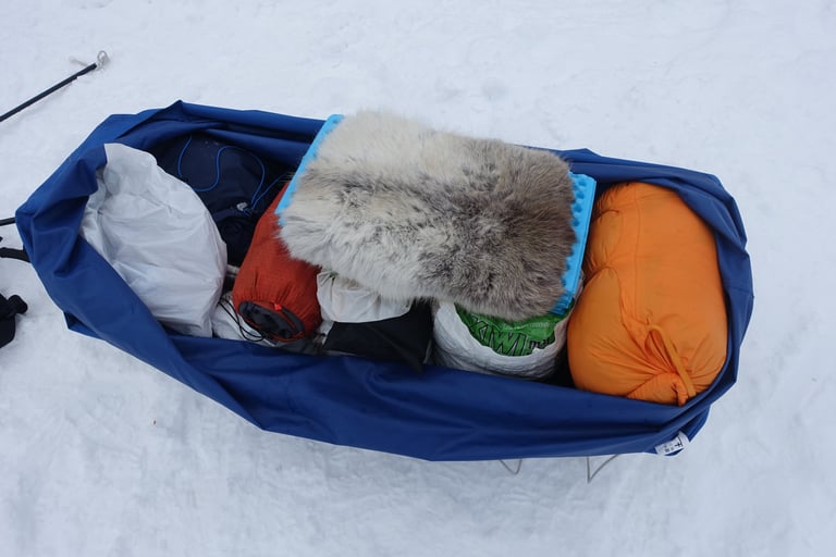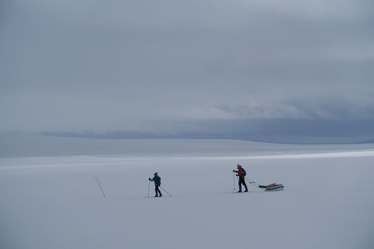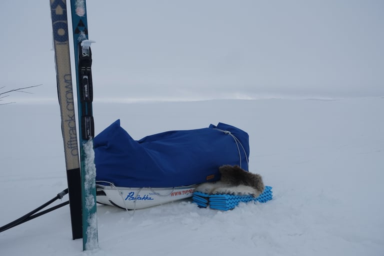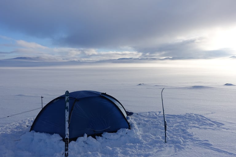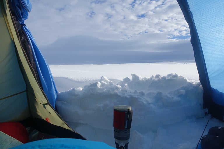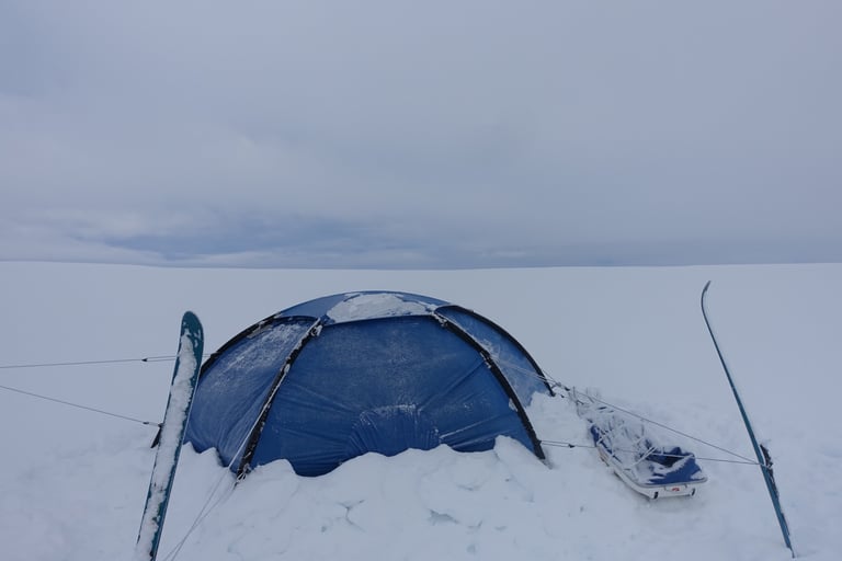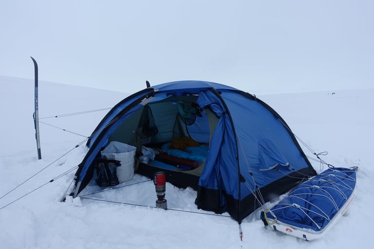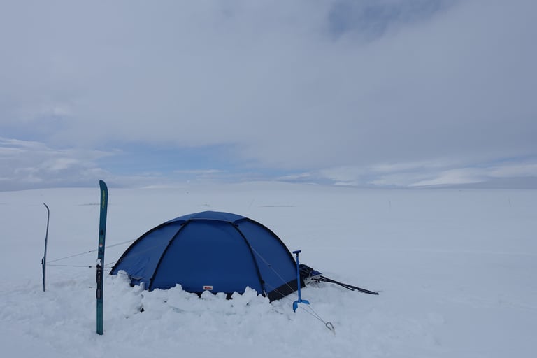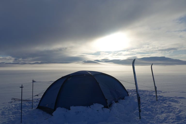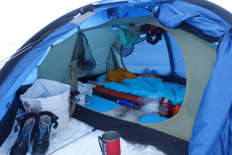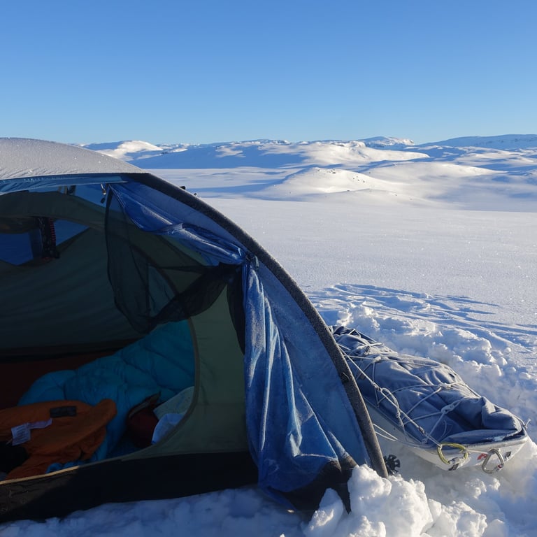 Cet endroit où tu rencontres des gens qui reviennent du Groenland et qui partent en Antarctique, quelle inspiration ! Le jour du bâton cassé, ou quand des norvégiens t'aident à réparer un bâton avec une sardine de tente sous la neige, incroyable de gentillesse. Prouesse, il tiendra jusqu'à la fin. Ou le jour où tu croises des gens sur leur canapé d'expédition pour le déjeuner, toi qui était déjà fière de ta peau de renne. Glisse de folie dans de belles immensités, la pulka s'allège clairement. Camp magnifique et tôt pour profiter de la vie sous la tente, surtout la dégustation de plats lyophilisés ! Faire fondre la neige ça occupe plutôt bien.