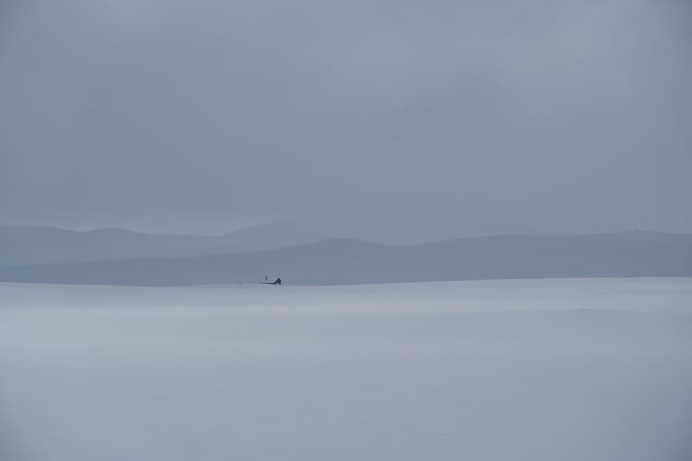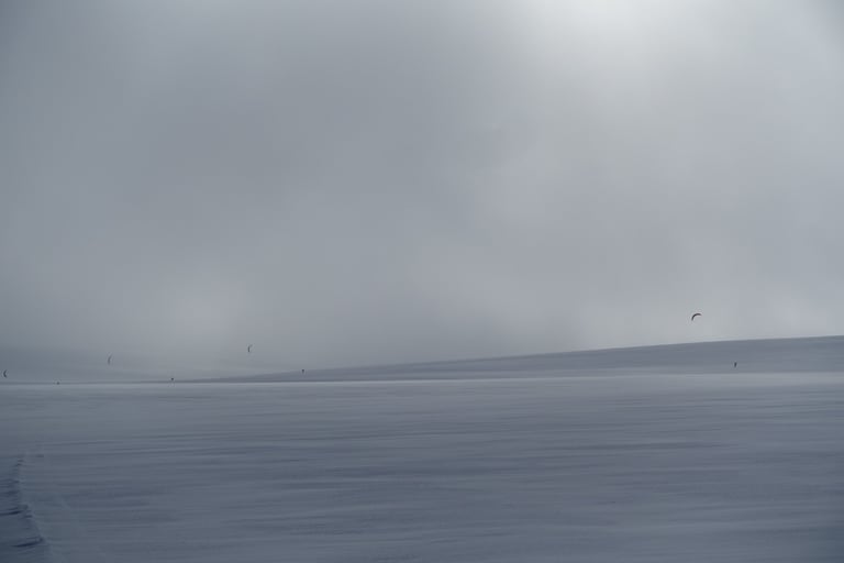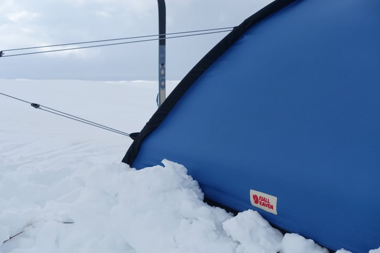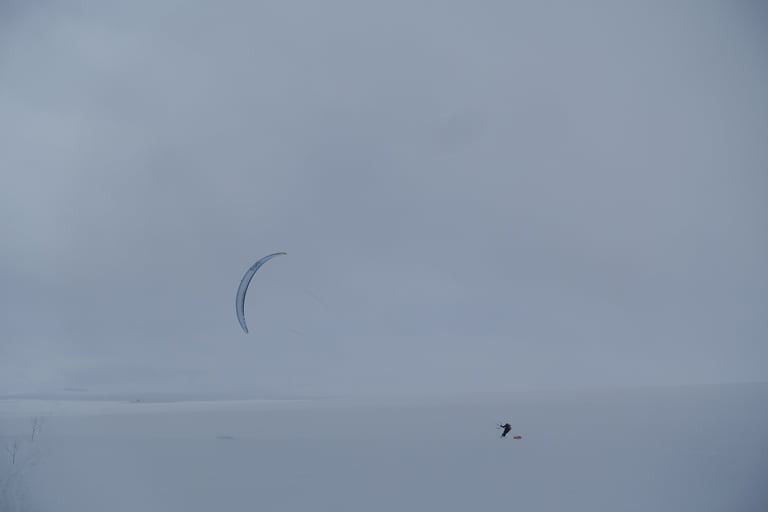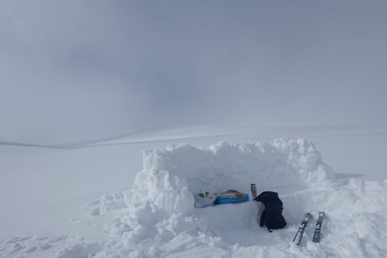 Quand le vent tourne pendant la nuit, comme un igloo au matin. Ça tombe bien je voulais apprendre à en construire. Publicité mensongère qui parlait (enfin) d'un jour de beau temps, tant pis le rêve d'une vie sans Gore-Tex prend de l'ampleur ! Plusieurs heures de White Out histoire de ne pas perdre les bonnes habitudes. L'envie de Snow Kite qui grandit encore dans ces conditions, ils se régalent ! Ou quand un canapé de neige apparaît dans le blanc, grand merci aux bâtisseurs. Crux de l'expé avec le passage de la route, en immense décalage de civilisation. Sublime camp pour cette dernière nuit, avec un panorama incroyable sur Kraekkja !