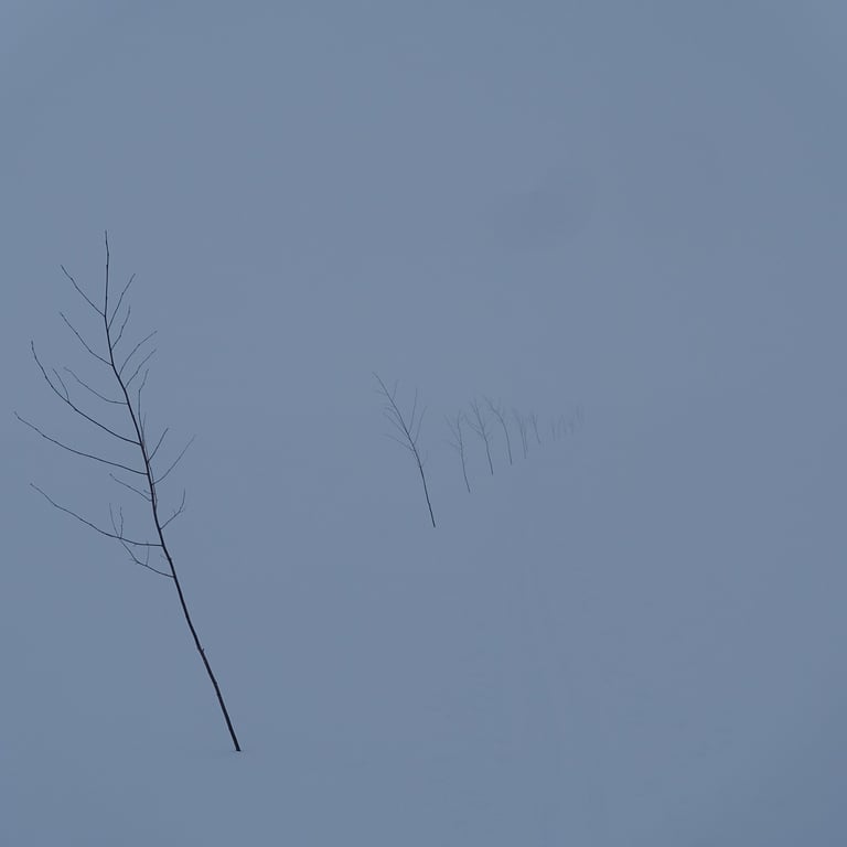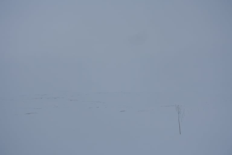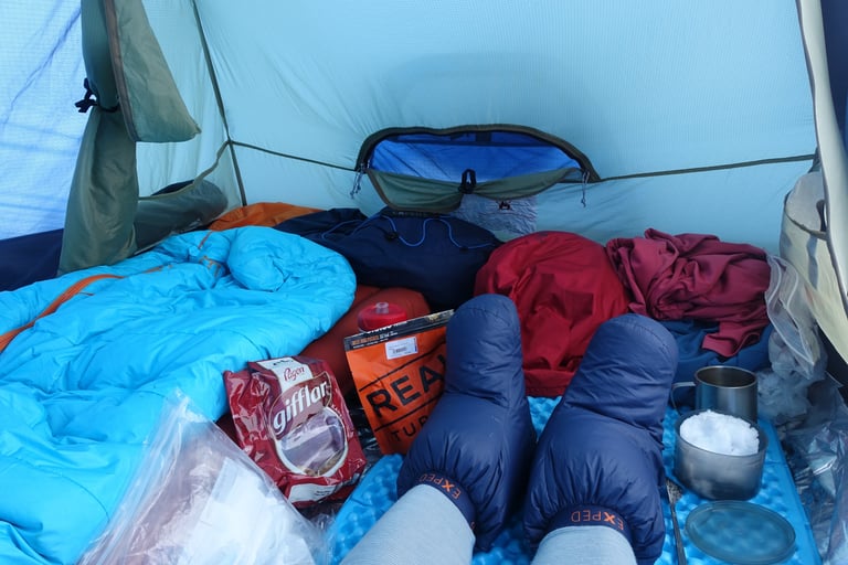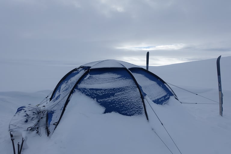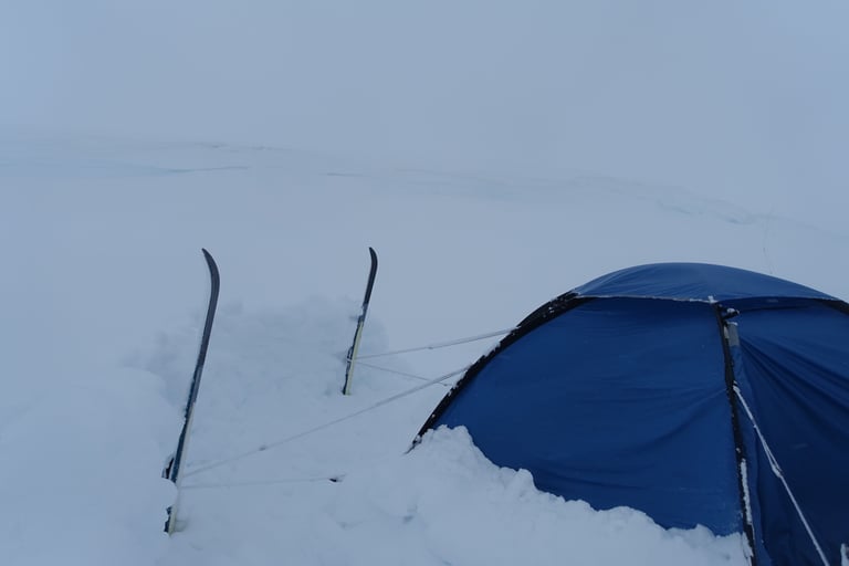 L'appréhension et le stress laissent place rapidement à l'apaisement et le sentiment d'être à la bonne place, à skier dans cette étendue blanche. Belle ambiance de début dans le blizzard. La tempête avant la tempête. Vertiges dès que le regard quitte les branches balisant le chemin. Premier camp dans le blanc total.