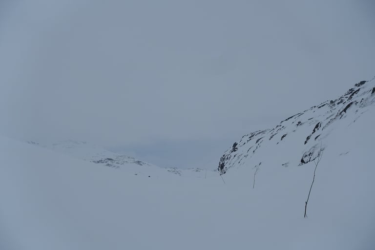 Surprise, un jour de White Out. Du blanc, du vent, et de la neige. L'espoir d'avoir des traces quand de rares personnes sont croisées, qui s'évanouit en 5 minutes car elles se recouvrent déjà sous les rafales. Toujours beaucoup de plaisir d'être là à skier. Réflexion du jour : si tu veux de la neige, elle doit bien tomber.