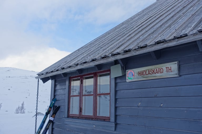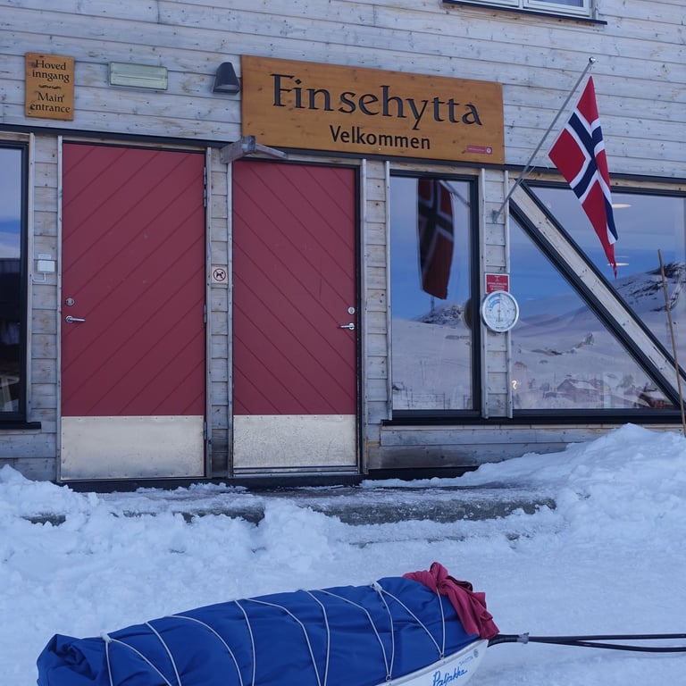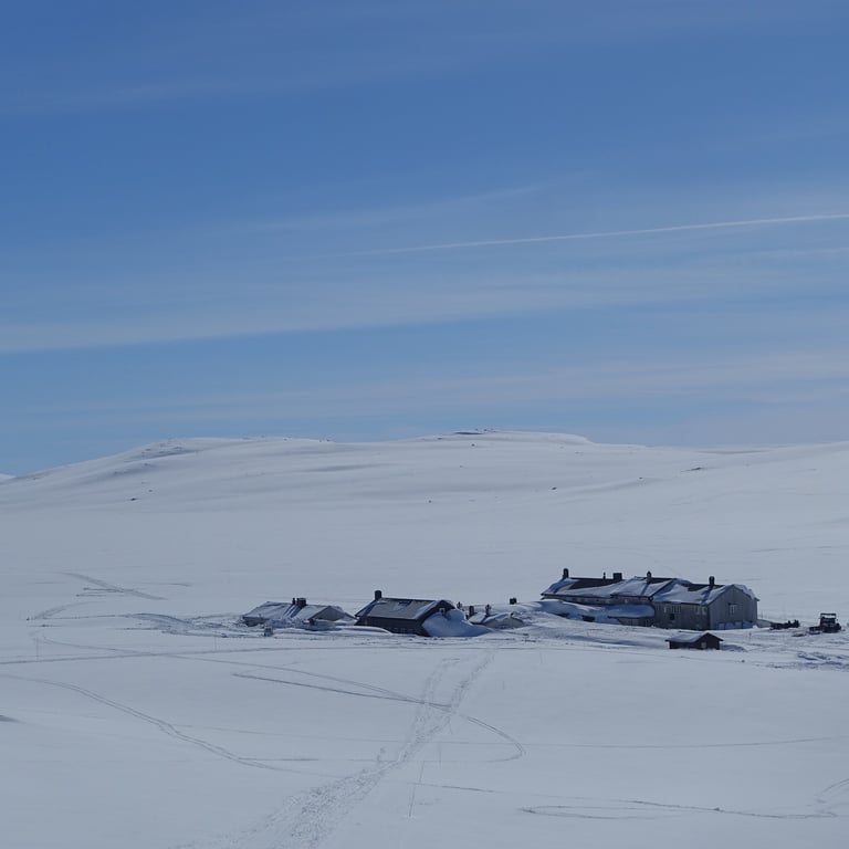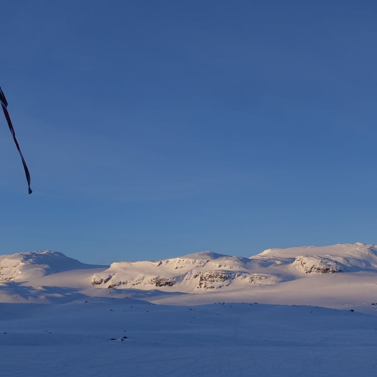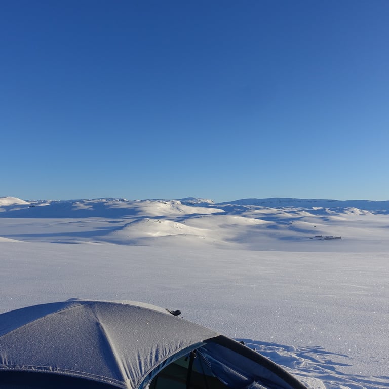 Grand bleu froid, c'est un autre monde si beau. Réveil magique dans ce panorama. Savourer ces derniers moments dans la tente en lisant au soleil avec ce bon café lyophilisé, le bonheur ! Quelle bonne idée ce livre en suédois, c'est bien plus léger vu le nombre de pages que je lis. La vie en bleu et blanc pendant ces heures de voyage sur la neige jusque Finse. Pour une fois ce n'était pas que moi le bleu. Le rêve de vie sans Gore-Tex réalisé, la dinguerie ! Autant de monde croisé que sur le reste de la semaine, quel contraste. Puis, soudain, Finse se dévoile à un col, l'émotion de cette aventure qui s'achève et de la rencontre avec ce temple de l'aventure polaire.