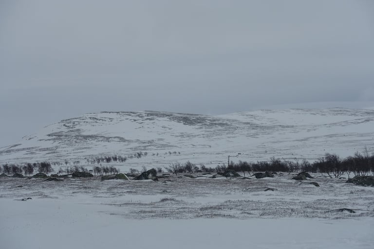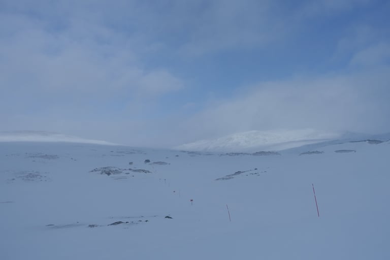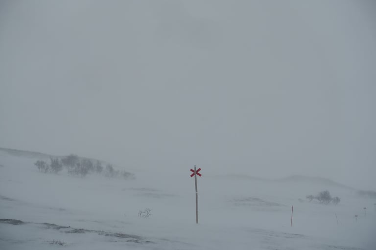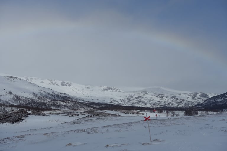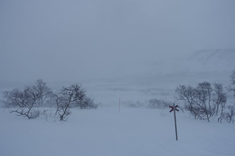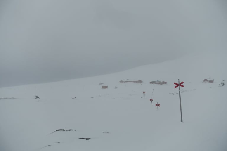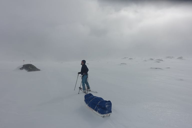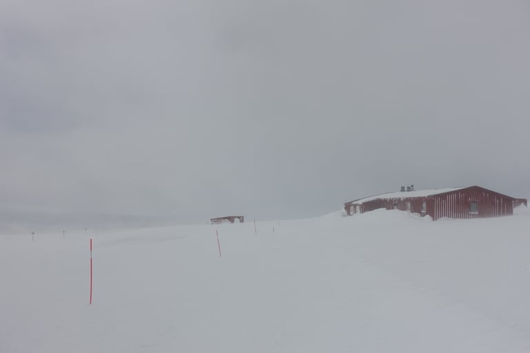 Quel plaisir au réveil ! Je suis conquise par le camping sur neige. Une longue étape m'attend aujourd'hui. J'ai prévu de skier jusqu'à Gåsen avant que la tempête s'empire. Après les premiers kilomètres dans la forêt, j'en sors peu à peu et je m'élève sur le plateau. Tout est en noir et blanc et le vent souffle fort. Je suis bien contente que le chemin soit si bien balisé avec les croix rouges ! Un moment surprenant avec un magnifique arc en ciel qui se dévoile. La montée est dure dans le vent. Une pause dans l'abri de sécurité, où j'hésite à passer la nuit mais aller courage, plus que quelques kilomètres. Finalement, Gåsen se dévoile à travers le blanc, j'y suis ! Nous ne sommes que 3 à avoir bravé les éléments pour être ici. Le gardien nous accueille très chaleureusement, c'est un beau moment de convivialité isolés dans la tempête.