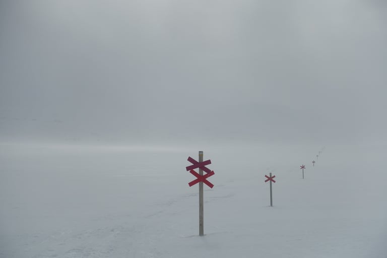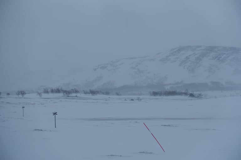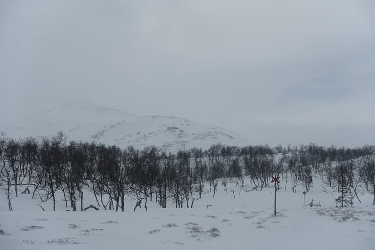 Le lendemain, nous décidons de partir vers Vålåstugorna avec les deux suédois. C'est mieux orienté par rapport au vent et nous ramène plus bas. Nous sommes bien contents d'être ensemble ! Tout est blanc et il est impossible de s'arrêter avec ce vent. Je comprends alors l'utilité du "Vind sack" et décide d'investir ! On ne voit que l'alignement des croix rouges pendant des heures, avec seulement quelques rares touches de noir venant du relief. J'arrive soulagée à la cabane. Malgré que ce soit le week-end de Pâques, il y a aussi peu de monde. Tout le monde s'est découragé pour de bonnes raisons ! Je resterai deux nuits ici et j'en profite pour contribuer à la vie commune. Les cabanes suédoises sont effet en fonctionnement autonome : il faut aller couper du bois, chercher de l'eau et disposer des eaux usées. Il n'y a en général ni électricité ni chauffage central. C'est si rafraîchissant ! La journée de pause sera donc consacrée à tailler des buches et aider le gardien. J'aime ces moments de partage dans le voyage. Je retiendrai une première expérience d'allumage de poêle avec seulement du sapin, ça marche !