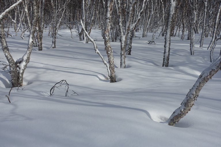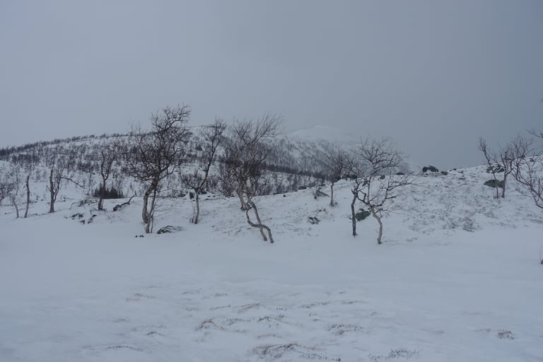 L'heure du départ a sonné, la pulka chargée et je quitte la cabane. Le vent est violent. J'ai l'impression d'évoluer dans une estampe japonaise en noir et blanc. Bonne nouvelle, le vent se calme après quelques kilomètres, je suis plus abritée et je profite de ces nuances de gris. C'est si agréable d'être en mouvement sur les skis après une journée de pause. J'avancerai jusqu'à la forêt pour me mettre à l'abri pour la nuit. J'ai hâte de redormir sous la tente.