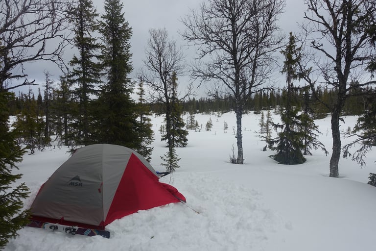 Les menus sont prêts, la liste de matériel aussi, je charge tout et c'est parti ! Je pars en skis de randonnée alpins car c'est tout ce que j'ai. La météo est loin d'être idéale, il neige et le vent souffle fort. Je prévois une petite première étape avec un camp à l'abri dans la forêt. J'aime beaucoup cette liberté sur les skis, et le rythme lent de progression. Il y a peu de neige cette année, il était temps de faire cette aventure. Premier camp sur la neige. Je suis bien les conseils, pour aplatir la neige, puis première rencontre avec les ancres à neige. C'est pas mal mais il y aura de quoi s'améliorer. Je m'installe pour cette première nuit, contente mais avec aussi de l'appréhension. Vais-je avoir froid ? Comment va se passer la suite ? Ils annoncent un temps exécrable. J'ai tout de suite aimé la fonte de la neige pour obtenir de l'eau, c'est tellement pratique ! Aller, bonne nuit.