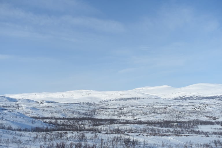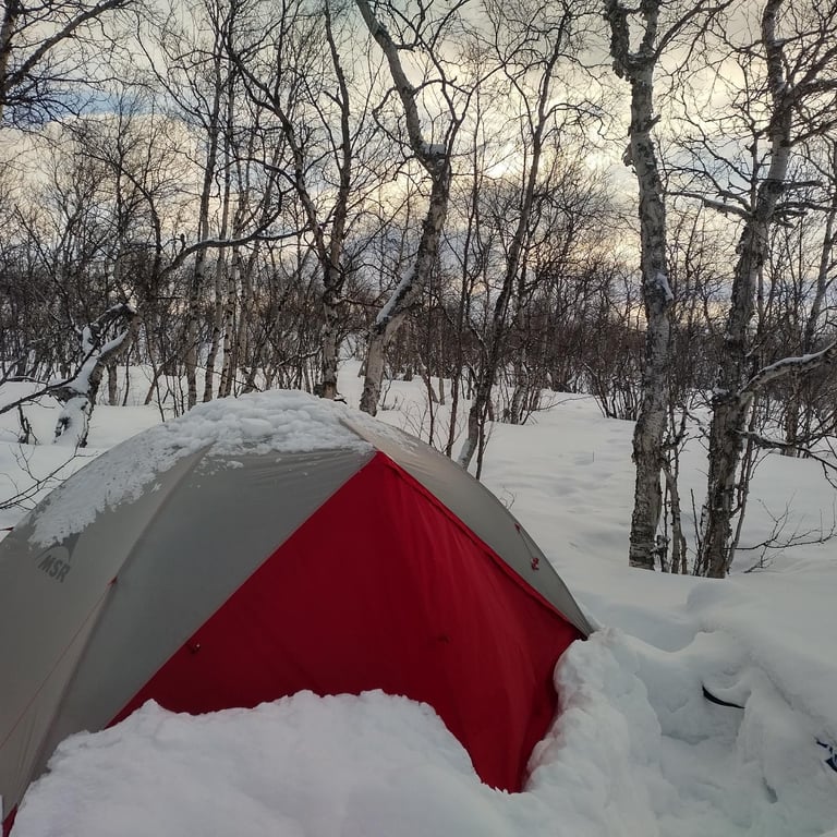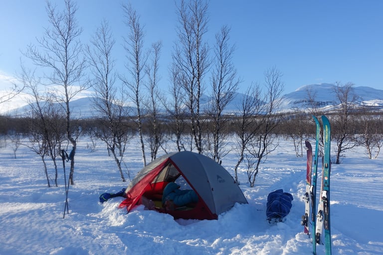 Abisko, que de souvenirs forts ici. Je me rappelle cette arrivée par le train de nuit assise. Épuisée et angoissée de cette première randonnée seule. Puis la rencontre avec ces paysages qui m'aimantent depuis. Cette fois, je suis bien plus préparée et c'est plus sûre de moi que je charge la pulka à la sortie du train. Une visite à la Fjällstation pour le souvenir et c'est parti ! Les premiers kilomètres sont dans la forêt de bouleaux bercée par le bruit de la rivière. Encore une fois la pulka est si lourde avec tout l'équipement. Mais l'étape sera courte aujourd'hui et je prévois un premier arrêt de plusieurs jours. J'installe le camp avec vue sur les sommets prévus pour le ski de rando. Dès cette première nuit, le ciel s'illuminera d'aurores boréales. Elles dansent en draperie. Je chausse les skis et me balade autour de la tente pour me réchauffer, c'est un moment fort.