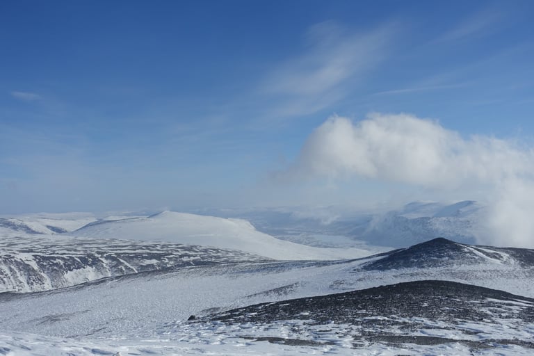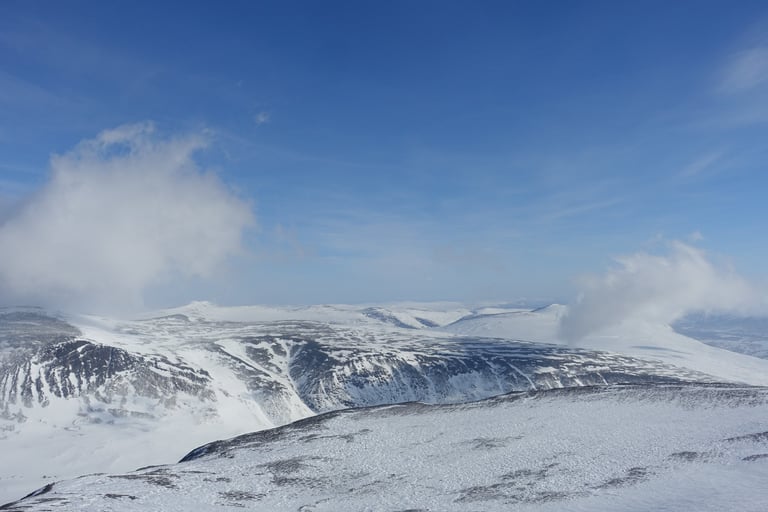Aujourd'hui je troque la pulka et les skis nordiques pour l'ascension du Giron. Magique de partir depuis la tente. La première partie est une navigation à travers la forêt de bouleaux. Il a plu les derniers jours, j'évolue donc sur du verglas. Ce sera donc du grand ski. Mais peu importe, l'atmosphère est dingue, je suis seule dans cette étendue blanche. Je croise quelques rennes sous le sommet, ils cherchent leur nourriture à travers ce sol gelé. Ces épisodes de verglas sont une catastrophe pour eux, cela les prive de lichen qu'ils ne peuvent atteindre. La vue est sublime, tout le massif de Kebnekaise se dévoile au sud, et le lac gelé au nord. Retour à la tente après du patinage sur cette glace, pour déguster un bon plat lyophilisé, festin !