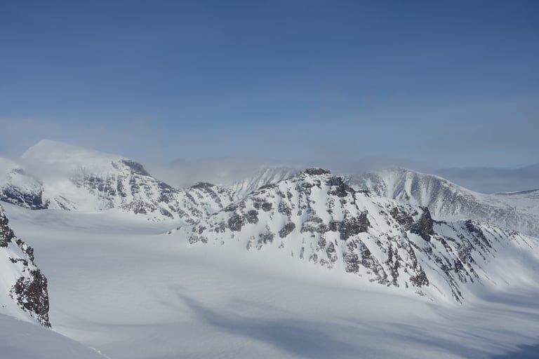 Le vent souffle fort avec des rafales à plus de 125 km/h. Tout le refuge craque avec le bois qui vit. L'épisode durera plusieurs jours. Il va même pleuvoir, c'est tellement surprenant pour la région ! Le grand nord est vraiment touché de plein fouet par le changement climatique... La première tentative de sortie tourne vite court, je n'arrive pas à garder les bâtons verticaux sous les rafales. Quelques accalmies me permettent de suivre les conseils précieux des guides locaux, merci à eux ! Le couloir de Jökelbäcken est une pépite bien protégée et il y a un champ de poudreuse malgré la tempête, le rêve. Malheureusement, dès que j'en sors au-dessus vers Kebnetjåkka, tout est soufflé et il ne reste pratiquement plus de neige.