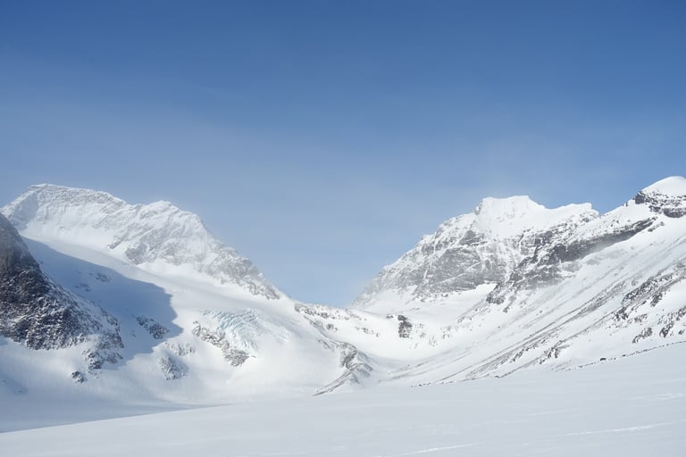 Le beau temps revenu, c'est l'heure du plan diabolique ! Cette journée restera comme une de mes plus belles à skis. La balade commence par la remontée du couloir de Jökelbäcken, où je retrouve un groupe qui part faire l'ascension de Kebnekaise. Je bifurque vers le col de Södra Nischen. Le panorama est sublime, je longe Kebnekaise, avec la vue sur le massif. Puis, au col le bassin du Storglaciären se dévoile. Le glacier porte bien son nom, il est immense. Tout est immaculé après les chutes de neige. Je prends bien mon temps pour analyser les conditions avant de m'engager seule sur le glacier. Je choisis notamment une ligne sans cassure de pente pour minimiser le risque de crevasse. Les conditions sont excellentes et il y a des mètres de neige cette saison. C'est un régal, et quel sentiment, seule dans cette immensité ! Le voyage continue avec la remontée vers le refuge de Tarfala. C'est une vallée à caractère alpin, très surprenant pour la Suède. Le refuge est un bijou. Je m'y arrête seulement pour faire connaissance avec le gardien et déposer mes affaires pour la nuit. J'ai encore envie de skier et il me conseille une belle pente. La neige y sera si bonne que je remonterai une deuxième fois ! Mais l'heure tourne et il est temps d'aller profiter du sauna avec vue panoramique. Je serai seule au refuge ce soir donc c'est un moment hors du temps.